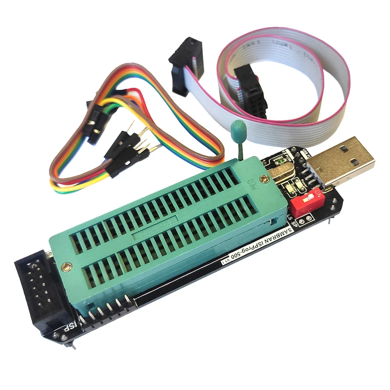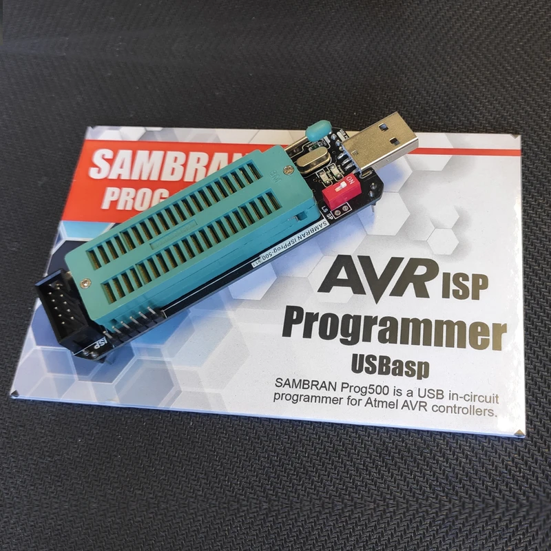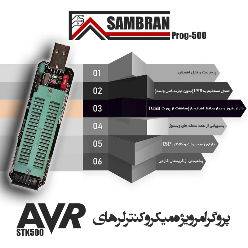 پروگرامر SAMBRAN PROG500 یک سخت افزار کامل برای برنامه ریزی میکروکنترلرهای AVR میباشد. این پروگرامر مطابق با پروتکل STK500 و بر اساس USBasp طراحی و ساخته شده و دارای قابلیت های مختلفی همچون خواندن، نوشتن و برنامه ریزی میکروکنترلرهای AVR و حافظه Flash، EEPROM، فیوز بیت ها و ... میباشد. سخت افزار این پروگرامر در ابعاد مناسب و کوچک طراحی شده است به طوریکه که فقط 3سانتیمتر عرض و 12 سانتیمتر طول دارد و این باعث میگردد فضای کمی اشغال کرده و به آسانی قابلیت حمل و نقل در داخل کیف را داشته باشد. این پروگرامر میتواند به صورت مستقیم و بدون هیچ واسطه ای از طریق درگاه USB به رایانه شما متصل شده و عملیات پروگرام کردن میکرو را انجام دهد. پروگرامر PROG500 شرکت سامبران به کاربر اجازه میدهد تا از سه طریق مختلف میکرو خود را پروگرام نماید: در روش اول کاربر میتواند میکروی خود را روی زیف سوکت قرار داده و اقدام به پروگرام کردن میکرو نماید. در روش دوم در صورتیکه کاربر میکروی خود راروی PCB لحیم کرده باشد میتواند از طریق سوکت ISP و کابل IDC2x5 که همراه محصول ارائه شده است اقدام به پروگرام کردن میکرو نماید. روش سوم استفاده از سیم جامپرهای رنگی نر به ماده ای است که همراه محصول ارائه شده است. در این روش در صورتی که کاربر میکروی خود را روی بردبورد قرار داده وقصد ندارد میکرو را از برد بورد جدا کند کاربرد دارد. در این روش کافیست تا کاربر سیم جامپرها را به پین های اختصاصی که در پروگرامر تعبیه شده است (MOSI-MISO-RST-SCK-VCC-GND) وصل کرده و در سمت بردبورد نیز به پایه های متناظر متصل کند و سپس عملیات پروگرام کردن را از طریق نرم افزار انجام دهد. از دیگر قابلیت های مهم و حیاتی این پروگرامر میتوان به وجود مدار و فیوز محافظ روی پروگرامر اشاره کرد. وجود فیوز SMD 500mA روی پروگرامر باعث میگردد تا در صورتی که در سمت مدارشما اتصال کوتاهی یا اضافه بار(جریان) رخ دهد پورت USB رایانه شما آسیب ندیده و کاربر با اطمینان خاطر به برنامه ریزی میکروی خود ادامه دهد. این پروگرامر از دارای پایه های احتصاصی جهت پشتیبانی از کریستال و اسیلاتور خارجی میباشد. وبسایت سازنده پشتیبانی کاملی از محصول ارائه کرده و آخرین نسخه درایور و فایل جامع آموزشی (فارسی و انگلیسی) را در اختیار کاربران قرار میدهد.